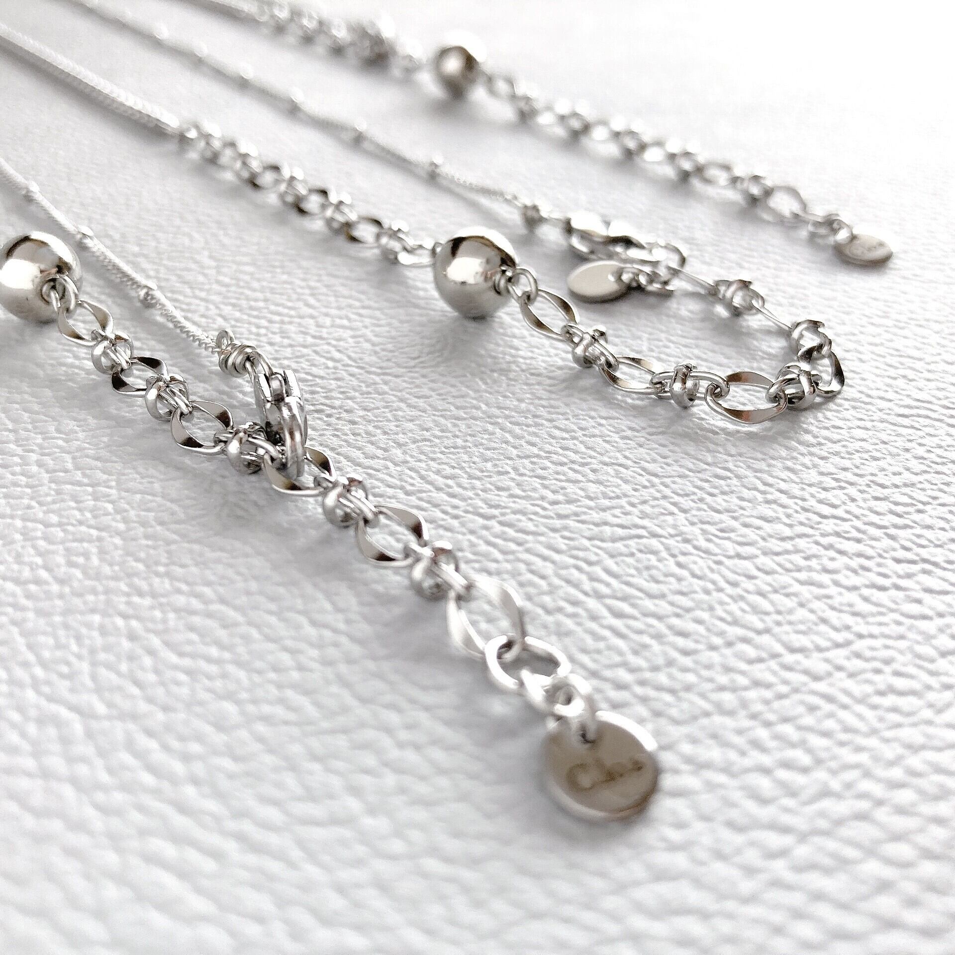 異なるチェーンを3種とメタルボールを合わせた、切り替えのあるネックレスです。留め金は大き目のカニカンを使用。
