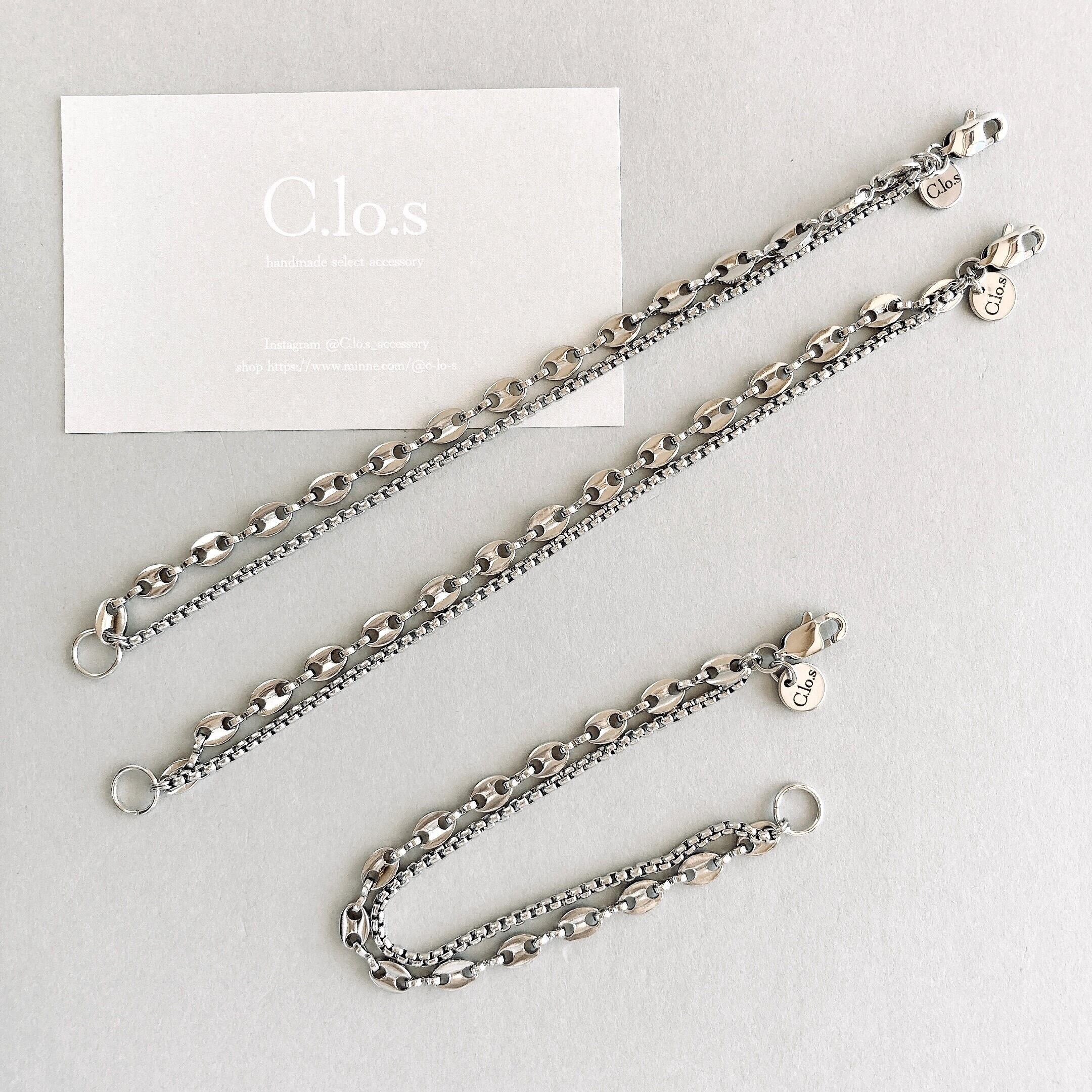 異なるチェーンを合わせたブレスレットです。